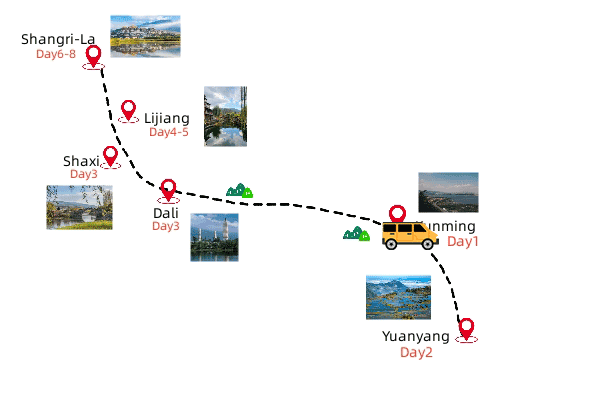 Starting from Yuanyang, view the splendid sunset and sunrise in the terrace scenic spot, then take an immersive exploration to the Ancient Town of Dali, experience the ethnic tie-die in the local workshop. Driving north to Lijiang, stroll around the Ancient Town of Lijiang, passing by the breathtaking Tiger Leaping Gorge, pay a visit to the Buddhist Songzanlin Monastery. A 8-days’ tour takes you to explore the charming Yunnan.