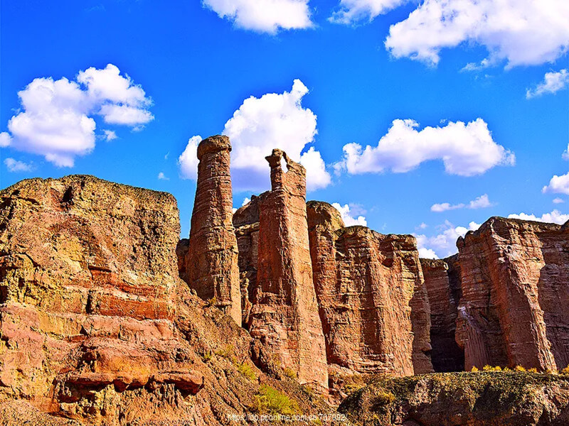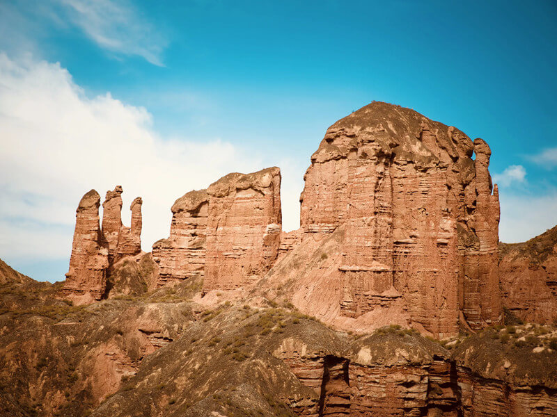 Binggou ( Ice Valley, 冰沟 ) Danxia, with an altitude of 1500-2550m, as an ancient geomorphic development happened in about the Jurassic period. It is a result of red sandstone erosion, together with its geological structure and long-term desert conditions, wind and water erosion. During the mid-Cretaceous age, iron and other elements contained in the sediment started to exchange and oxidize, which formed different layers of colors in different strata. It is cut by vertical or high angle cleavage. Under the comprehensive action of differential weathering, gravity collapse, water dissolution, wind erosion, etc., it forms a castle-like, pagoda-like, needle-like, column-like, rod-like, mountain-like or peak forest-like terrain with cliffs.