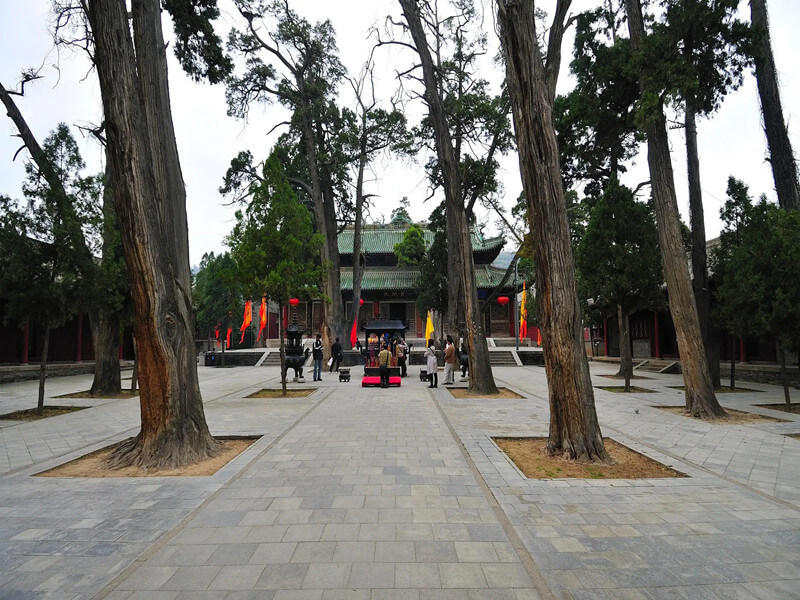 64 cypresses, symbolizing 64 diagrams, were planted in every yard of the Fuxi Temple in the Ming Dynasty. There are only 37 remaining cypresses. They are stately and lush, and their dense branches and leaves block the sun. Inside the gate, the Fuxi Temple has two old locust trees. The one on the east side is still alive though the trunk is hollow. It was planted during the Tang Dynasty according to an appraisal.