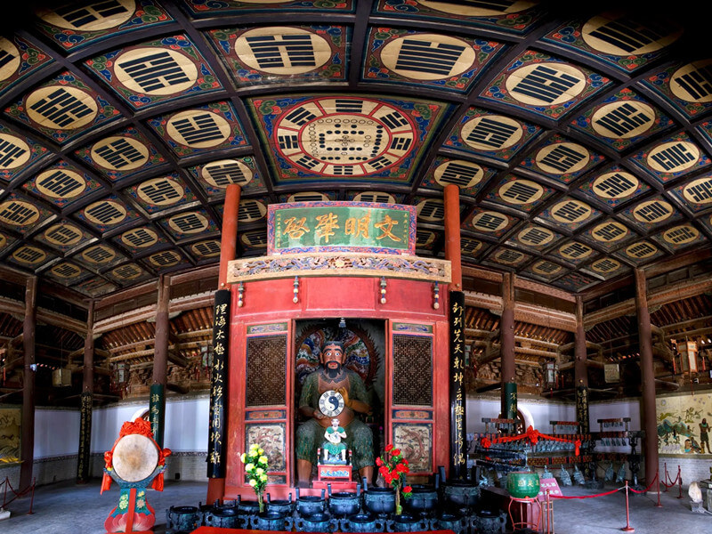 Congenital Temple is the main hall and is located in the very middle part of the back of the middle yard. It is the main building of Fuxi Temple, and it was built grandly on a 1.7 meter high brick platform. In the magnificent hall stands a huge Fuxi painted sculpture. On the ceiling is painted the Taiji Eight Diagram, and its four edges are divided into 64 cells. Behind the Congenital Temple is the Tanji Temple that is also known as the Back Temple, the Sleeping Temple or the Chamber. It was built slightly smaller than the Congenital Hall according to the custom: “sleeping hall after palace.” Originally, the Tanji Temple was built for the oblation of Fuxi, later for the Patron of Agriculture.
