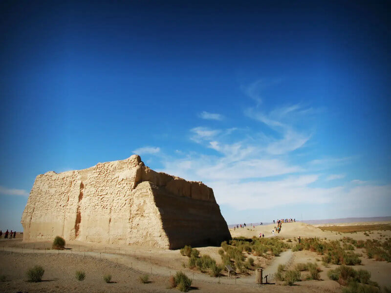 Located in the north of Dunhuang, there are branches of the Great Wall of the Han Dynasty, such as Yumenguan to Yangguan, Yangguan to Danghe River estuary. After more than 2,000 years of wind, rain and sand damage, some of the Great Wall was razed to the ground, and most of the Great Wall was preserved. Among them, the Great Wall of Danggu Tunnel, located on the west side of Yumenguan was well preserved. Its base is 3 metres wide, its residual height is 3 metres, and its top width is 1 metre, it is the most complete section of the Great Wall of the Han Dynasty.