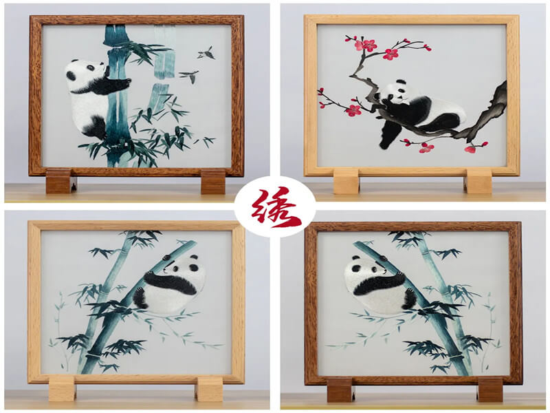 Sichuan Embroidery and Jiangsu Embroidery, Hunan Embroidery, Guangdong Embroidery are the Four Famous Embroidery of China, Sichuan Embroidery has a history of over 3000 years. It is characterized by precise stitch, thin needle, bright thread and elegat color, flower, bird, insect, fish, landscape and figure are all subject matters of Shu Embroidery, Its representative works include “otus&carp” AND “Giant Panda”.