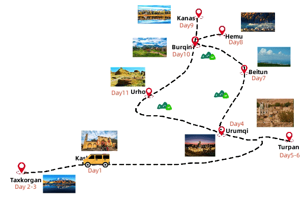 This 11 days Xinjiang trip, you’ll fully enjoy the best highlights of beautiful Xinjiang. In Kashgar, you’ll explore the exotic city by visiting Kashgar Old Town, Sunday Bazaar, Handicraft Street, etc. Besides, visit the Amanisha Khan Memorial Mausoleuma and sacred Yarkent Jami Mosque. In this tour, you can also fully immerse yourself into beautiful destinations including Turpan, Urumqi, Hemu, Kanas, etc.