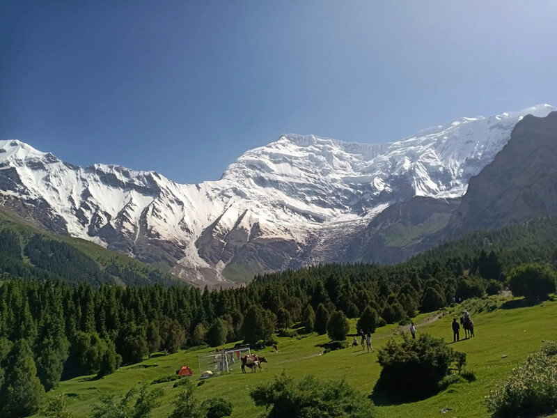 “Oytag” is an ancient Turkic language, meaning “a depression in the mountains”. Its natural landscape is dominated by virgin forests, frozen snow ridges, and glacial waterfalls. The landscape here is very distinct. In the distance is the Ailanish Snow Mountain at an altitude of 6678 meters. Under the snow mountain is the spectacular Qiblaze Glacier. Its active glaciers are 225 square kilometers. These modern glaciers are located in low-latitude mountainous areas. , Has been extended down to the forest area at an altitude of 2800 meters, so it is very rare.