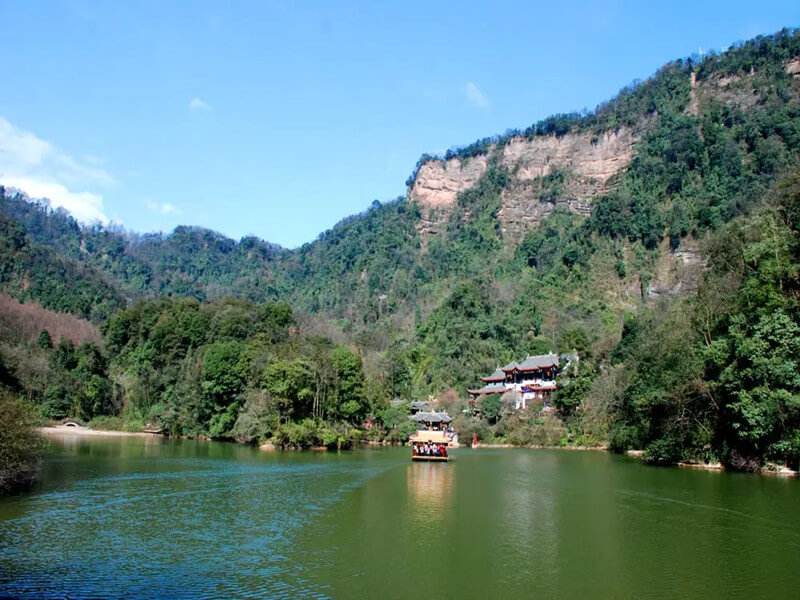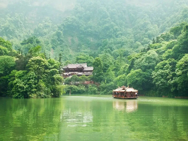 Altogether it has 36 peaks covered with thick forests of trees and bamboo, 72 caves, and 108 scenic spots. It gets its name from the way the peaks resemble the structure of a city wall. The name Qingcheng means a green city. Damian Mountain is its main peak and the Master’s Cave (Tianshitong) serves as its pivot. The mountain is well known for its serene scenery that contains halls and temples shaded by forests and enhanced by interesting legends and anecdotes.