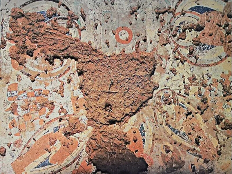 There are 3 caves, West Cave, Middle Cave, and East Cave. They are 2 meters high and I meter wide with rectangular entranced side by side. Only East Cave retains a sunken panel and most of the murals survive. In the central sunk panel painted a rectangle lotus. On the cave wall painted dozens of lifelike Buddha statues, the figure of the Buddha looks beautiful in design and living in expression. A remaining sitting buddha standing beside it. It has been proved that they are the earliest buddha caves extant in Western China, which can be dated to the second and third centuries,and they are also the Buddhist Caves in extreme West China.