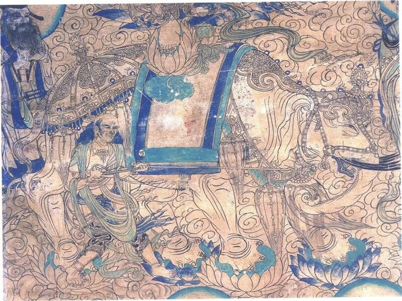 The lines took the methods of Tiexian (Iron Line, 铁线 ) and Lanyemiao (orchid-leave line drawing, 兰叶苗 ) and Zhelu (broken reed) plus Chuncaitiao (water shield thread) as support; Fucai (color applying) takes a large number of metallic green as the background color, which makes the picture become a green mural with “fresh color,” which covered the Buddhist story and preach. The Bodhisattva 菩萨 worship, human figures, grotto decoration designs, etc., of which Tales of Sutras of Samantabhadra as the most well-known.